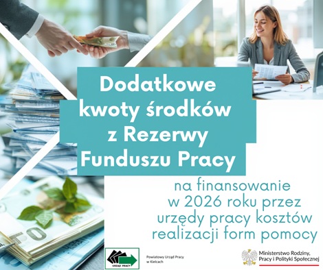 Powiatowy Urząd Pracy w Kielcach otrzymał dodatkowe środki finansowe z Rezerwy Funduszu Pracy na finansowanie kosztów realizacji form pomocy wysokości...